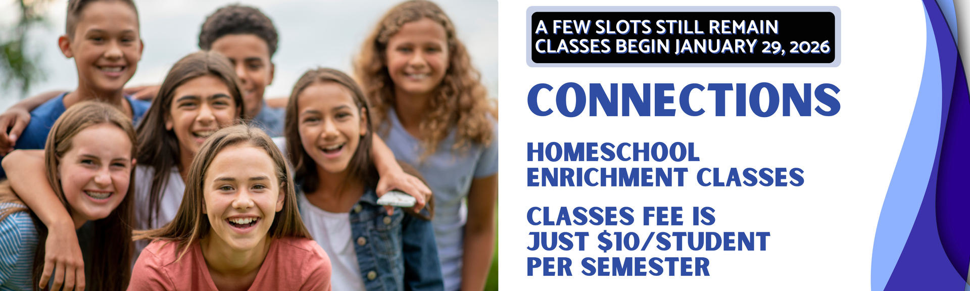 Our "Connections" classes are designed to enrich the educational journey of home-educated children, from newborns to high schoolers. We provide a social environment for your child to make lasting friendships while learning. Classes meet weekly on Thursdays before PE. We are currently accepting enrollments for next semester and operate on a Sept - Dec and Jan - May calendar, with classes changing each semester.